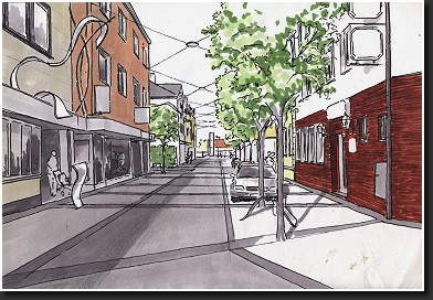 Begleitende Kunstobjekte und die klare Richtung der Straße spannen eine Achse zwischen dem geplanten neuen Magnetbetrieb Rewe - am Ende der Straße zu sehen - und dem hinter dem Betrachter liegenden Markt (Marker - Bild 12) auf.