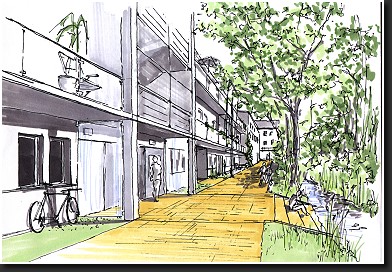 Die reizvolle Lage des bisher als Parkplatz genutzten Bauplatz an der Hüls inspirierte zu der Nutzung als Wohnanlage.